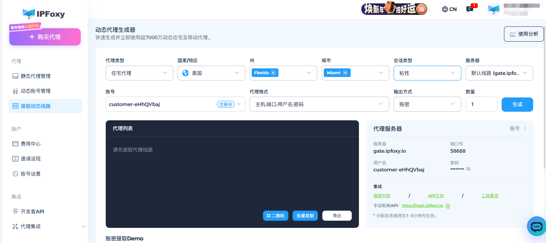 我们使用IPFoxy动态住宅代理服务,它能够自动轮换 IP 并支持HTTP/HTTPS/SOCKS5 多协议,且IP池达9000万以上真实IP,滥用率低,适合 Etsy 这类敏感站点的抓取策略,通过海量纯净的住宅 IP 池,能让你的爬虫模拟成全球真实的“真人家庭用户”,从而顺利完成抓取任务。