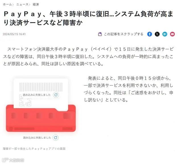 5 月 15 日消息,据《朝日新闻》《读卖新闻》报道,日本软银公司旗下的无现金支付服务巨头 PayPay 于当地时间今日 12:15 左右突发故障,导致功能无法使用。用户尝试使用 PayPay 时,App 会弹窗提示“出错,请重试”。此次故障正好遇上饭点,影响了不少正在购买午餐的用户。