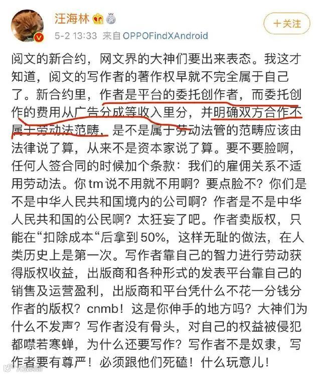 知名编剧汪海林在微博上爆粗力挺网文作者维权