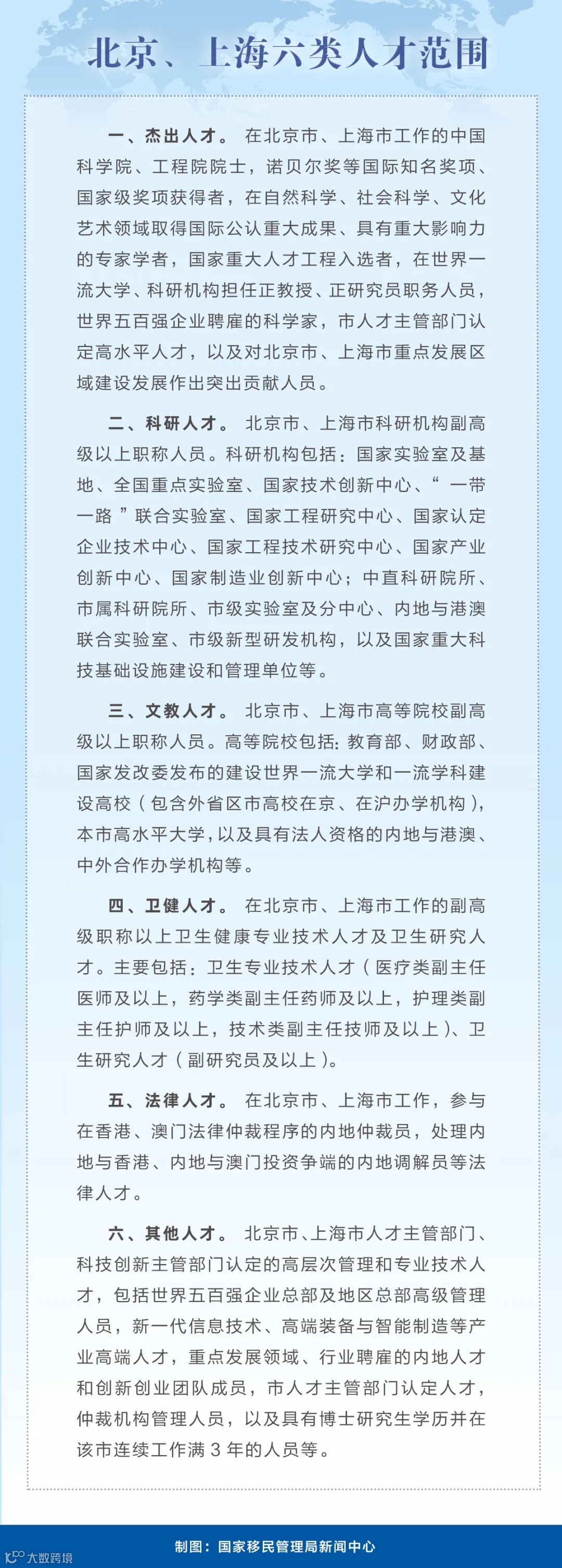三、北京、上海六类人才可以申办赴港澳人才签注。将赴港澳人才签注政策由粤港澳大湾区内地城市扩大至北京、上海。在北京、上海工作的杰出人才、科研人才、文教人才、卫健人才、法律人才以及管理人才等六类人才,可以凭有关人才证明,单独或者同时申请办理有效期1至5年不等的多次赴香港和赴澳门人才签注,每次在香港或者澳门停留不超过30天。