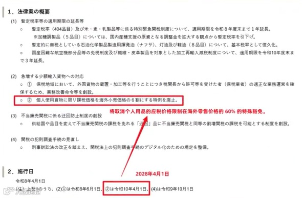 根据日本财务省最新公告,本次免税政策调整将于2028年4月1日零时正式生效。