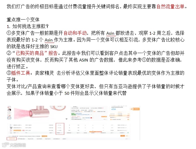1. 如何挑选主推款? ①多变体广告一般前期是开自动和手动,把所有Asin都放进去,观察1-2周之后,选择表现最好的1-2个Asin作为主推。因为同一个变体可以相互引流,多变体广告比较核心的就是选择好主推的SKU