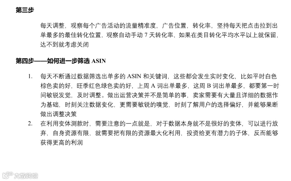 1. 根据竞争对手热卖颜色尺寸和自动跑出来的,出单三单以上的 asin,开启手动广告,单独投放,出单少三单以下非重点 ASIN 批量投放