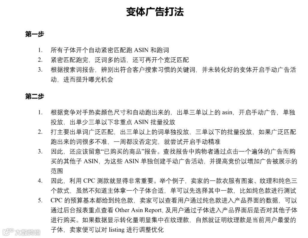 1. 所有子体开个自动紧密匹配跑 ASIN 和跑词 2. 紧密匹配跑完,泛词多的话,还可再开个宽泛匹配 3. 根据搜索词报告,辨别出符合客户搜索习惯的关键词,并未转化好的变体开启手动广告活动,进而提升曝光机会