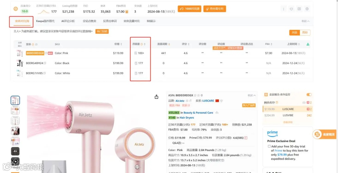 ③插件工具:卖家精灵 去分析评估父体里面整体评论销量表现最优的变体作为主推的子体。 变体对比/产品查询来查看哪个变体更好卖,但只有当亚马逊提供了子体销量的时候才会展示,如果子体销量小于50件则会显示父体销量来代替 字数有限看图片啦