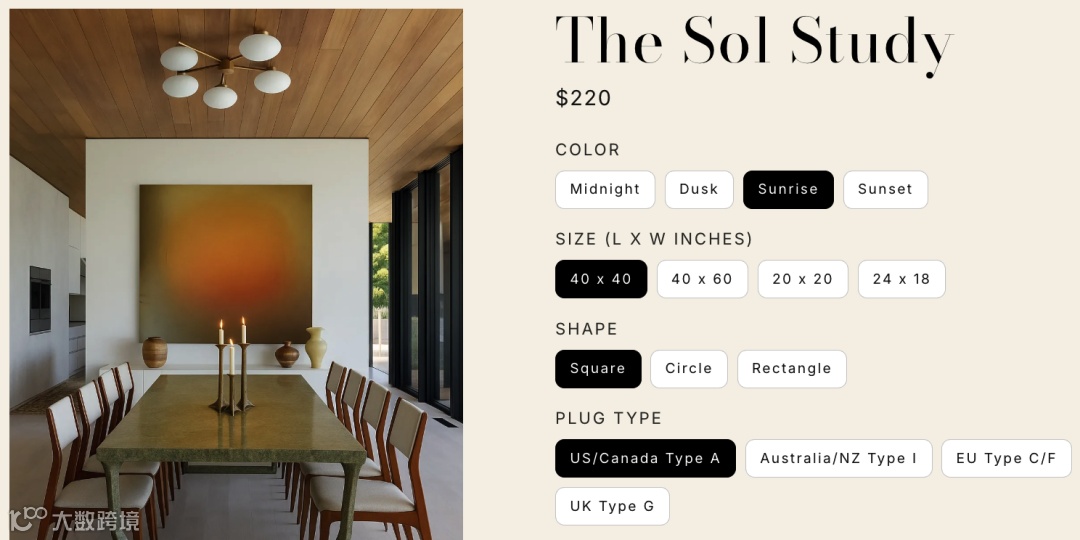 具体来看产品,The Sol Study来自Tyka Pryde独立站,有四个颜色(日出、黄昏、日落和午夜)、4个尺寸——以便能够适应面积大小不一的墙面,以及适配4个不同地区的插头类型供选择,最大尺寸40x60英寸,售价在$200-325。这个定价填补了宜家式快时尚家具(低价、廉价感)与几千美金的顶级设计名品(高门槛)之间的空白。能够吸引到范围更广阔的追求品质与个性、愿意为情绪价值付费的消费者。