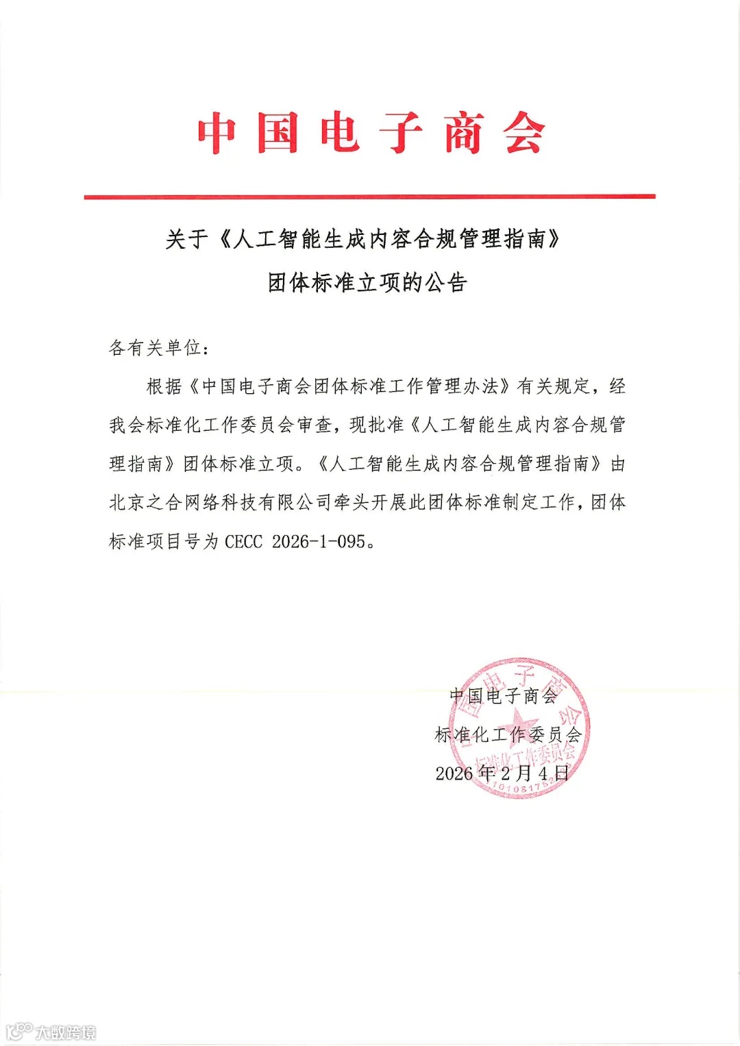 由中国电子商会归口管理、智合标准中心组织编制,联合公安部第三研究所、中国电子信息产业发展研究院(拟邀)共同起草的全国首个AI生成内容合规团体标准——《人工智能生成内容合规管理指南》正式出台。