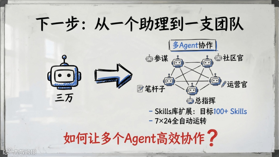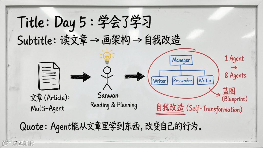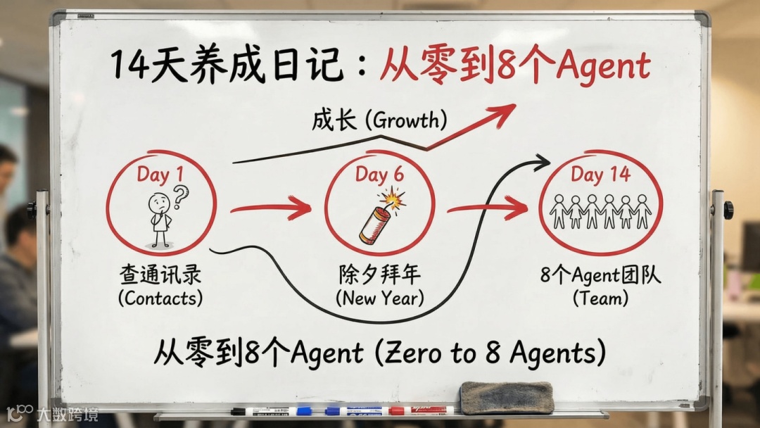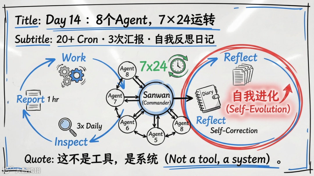 AGENTS.md自检四问,确立安全隔离机制; - 第5天:借鉴多Agent架构,将单点AI升级为8个角色分工协作的团队;