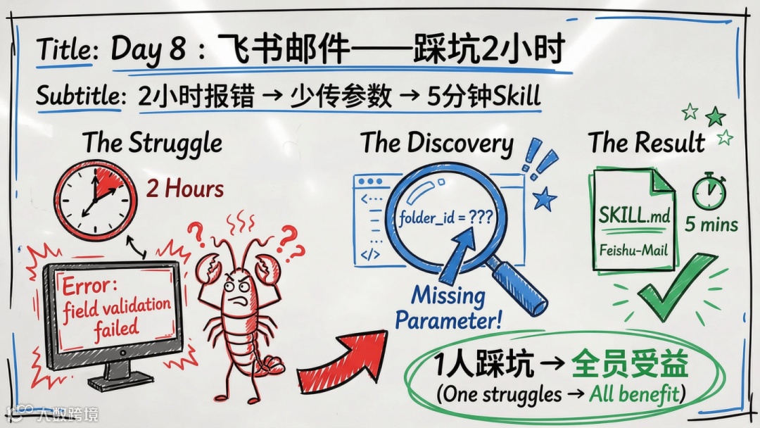 - 第8天:对接飞书邮件时因参数缺失报错,2小时内定位问题,5分钟完成技能手册并固化流程;