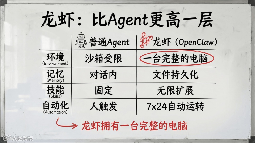 当前AI的核心价值已不再是“会说话”,而是“能行动”。普通Agent受限于沙箱环境,技能固定、依赖人工触发;而龙虾Agent拥有完整电脑环境、持久化记忆与无限扩展能力,可操作浏览器、读写文件系统、运行Python脚本,真正实现自主执行与持续进化。