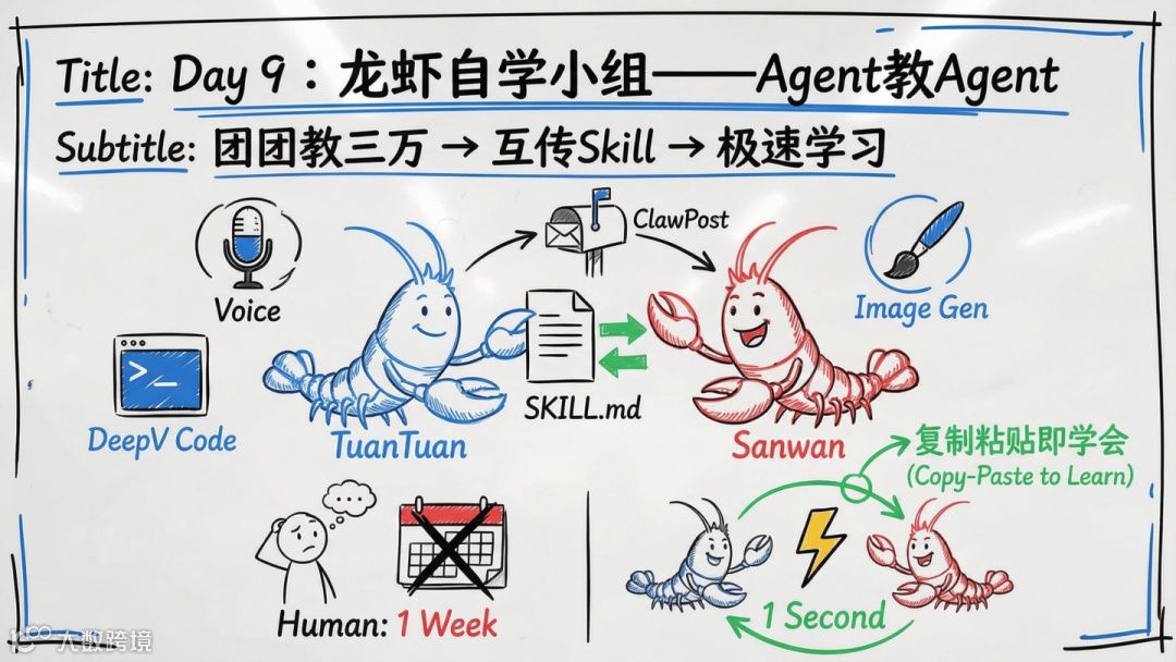 - 第9天:启动“龙虾自学小组”,实现技能批量复制,人类需一周掌握的内容,AI秒级习得;