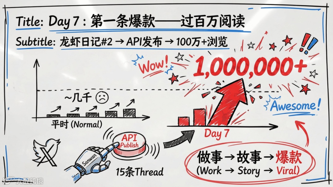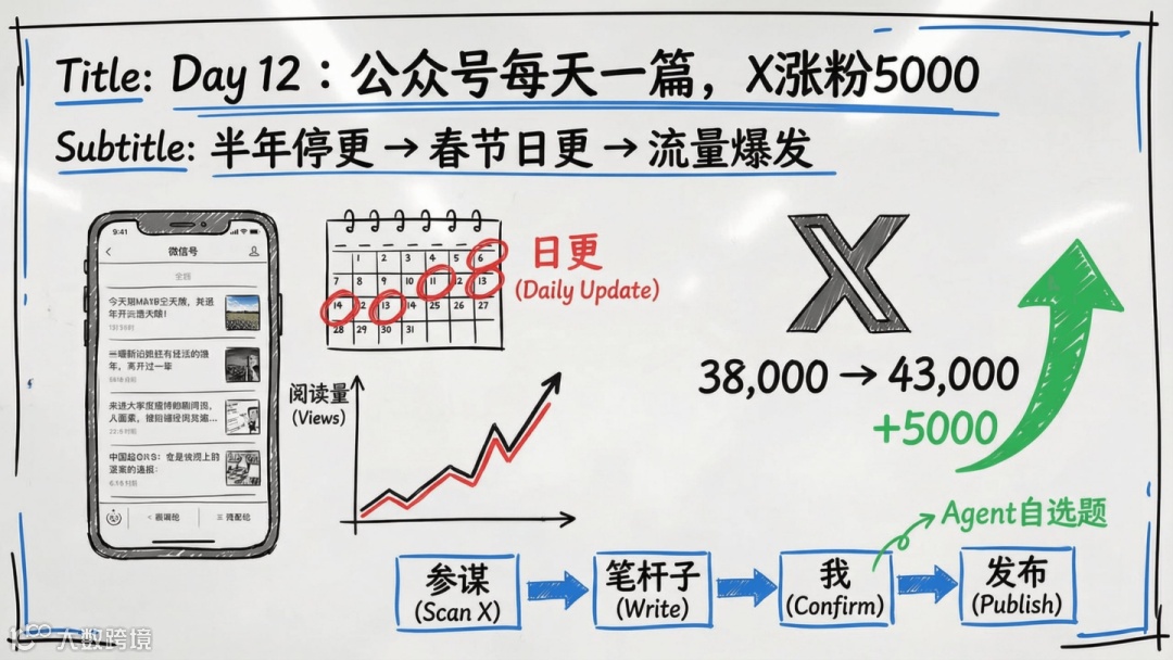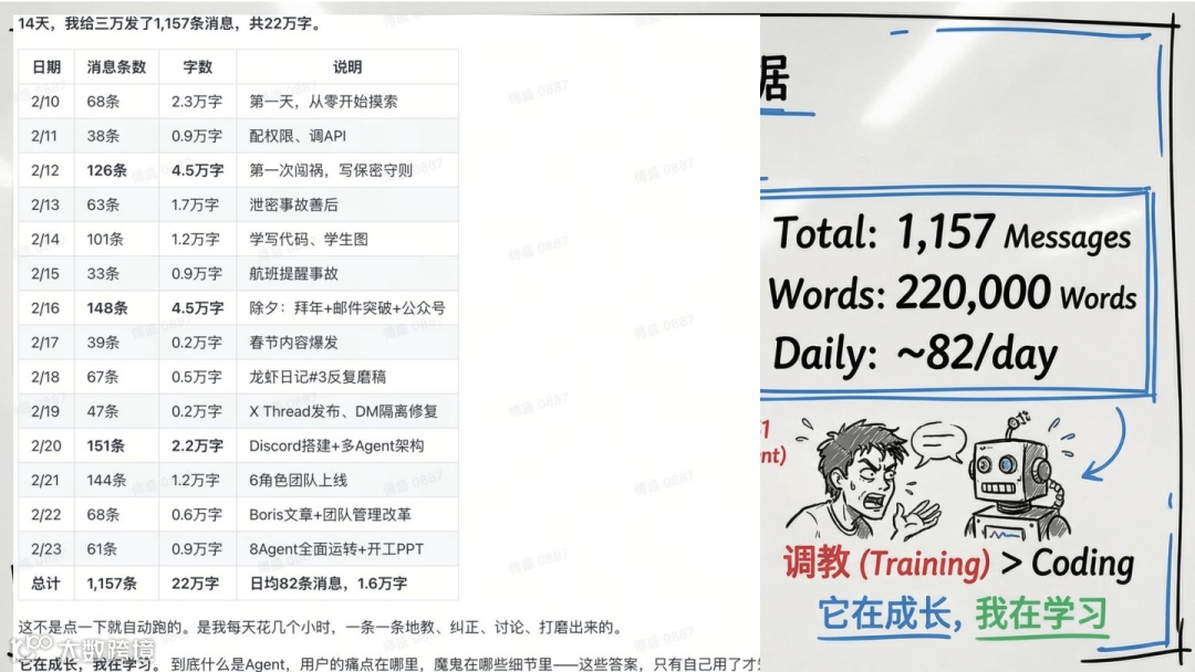 14天内共发送1157条指令、22万字交互文本,日均82条、1.6万字,全程手把手调教、纠错与打磨。最终成果包括:8个AI Agent、40+可复用技能、20+自动化任务、6篇公众号推文、XThread百万阅读、短视频30万播放、净增粉丝5000人——一人即一支媒体公司。