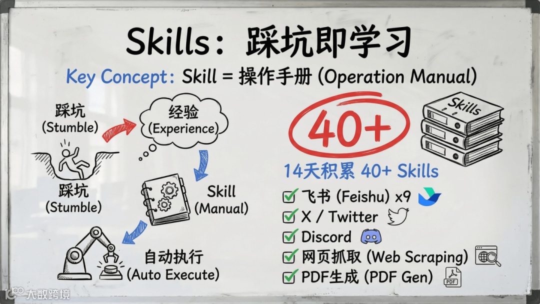 MEMORY.md存储长期知识,ACTIVE_CONTEXT.md记录当前任务上下文,TODO.md管理待办事项;未记录即无效,记忆是AI具备“思考力”的前提。 - 技能库:每踩一个坑即沉淀一份技能手册。从解决通讯录查询、网页抓取、PDF生成,到制定保密守则、优化推送提醒,14天累计40+可复用技能。