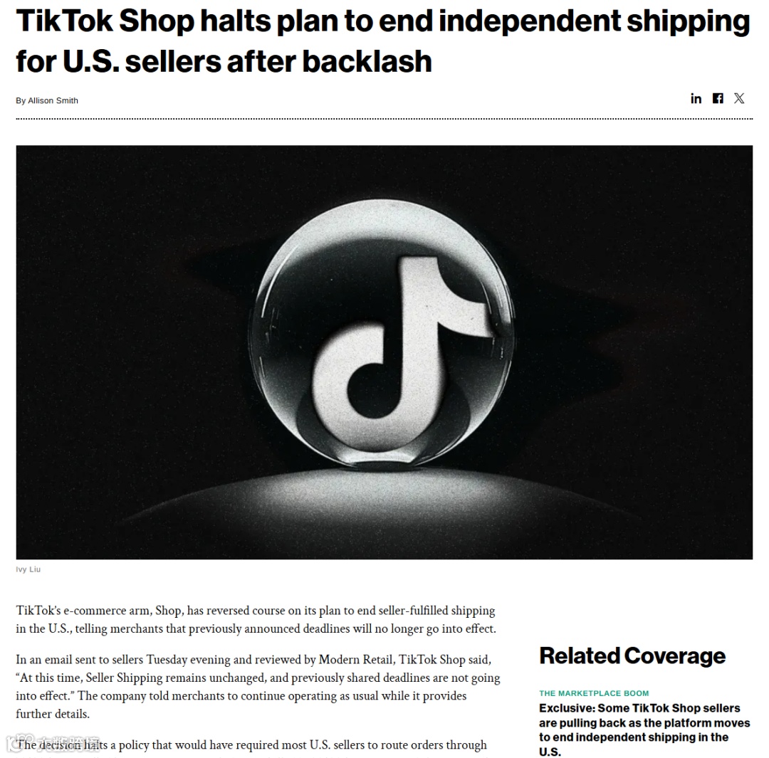 TikTok Shop近期向美国站卖家发送邮件,宣布暂停原定于本月底实施的物流新规,卖家自发货模式维持不变。