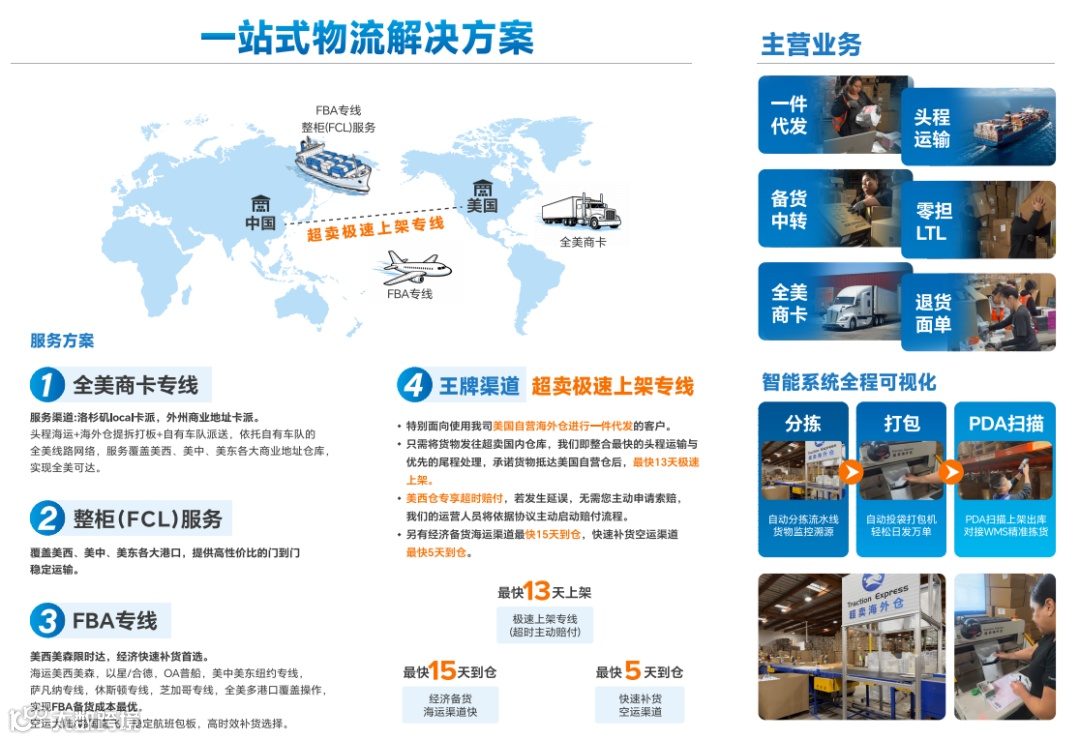 头程运输、一件代发、FBA/VC备货中转、退货面单、零担LTL、全美商卡。