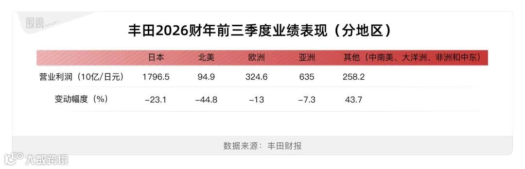 2026财年第三财季(2025年10–12月),丰田营收13.46万亿日元,同比增长8.6%;净利润1.26万亿日元,同比下降43%。前三财季累计营收38.09万亿日元(+6.8%),归母净利润3.03万亿日元(-26.1%)。