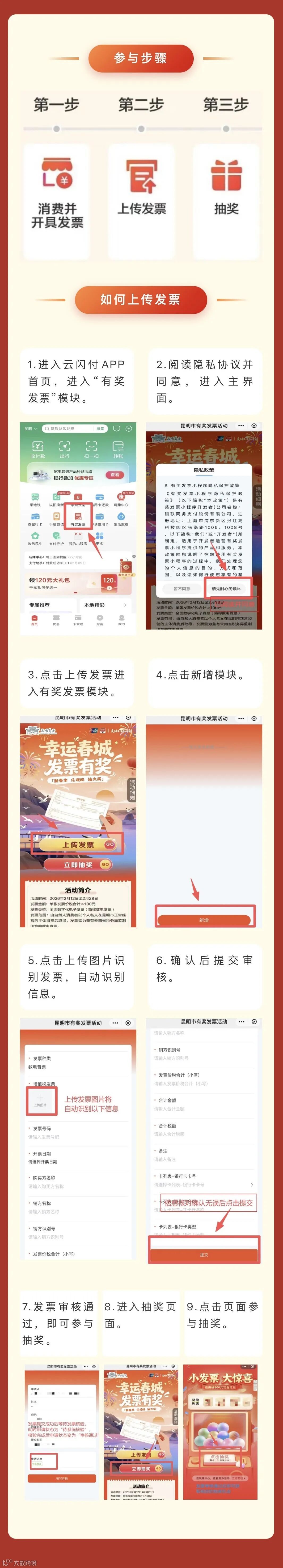 A2:目前可通过云闪付APP首页“昆明有奖发票活动入口”参与;后续将陆续开通支付宝、抖音、京东等平台渠道。