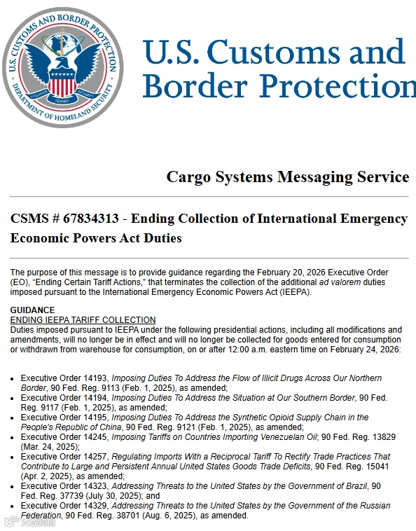 美国海关与边境保护局(CBP)正式发布CSMS #67834313公告,确认自2026年2月24日美国东部时间凌晨00:01起,终止依据《国际紧急经济权力法》(IEEPA)加征的额外从价关税。此举标志着此前围绕“芬太尼关税”及“对等关税”等紧急关税措施全面停止执行。