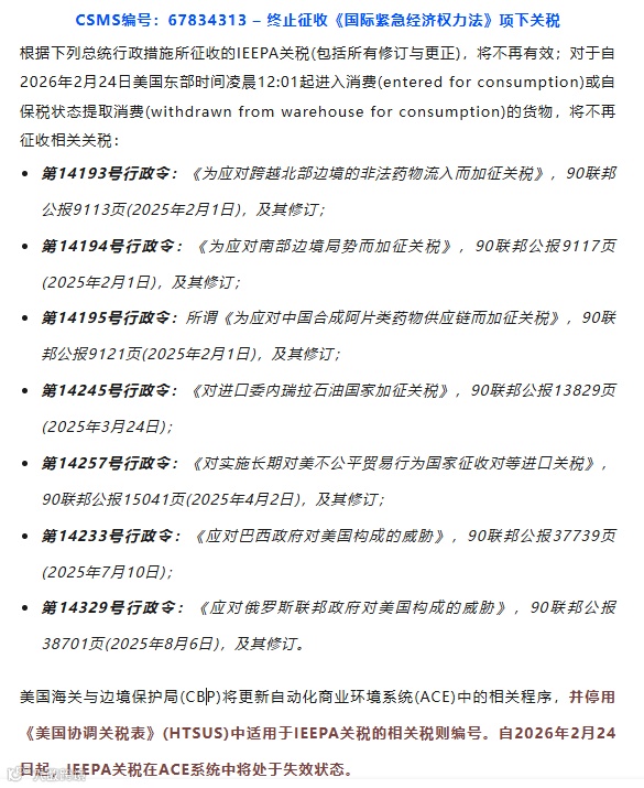 该调整源于2026年2月20日发布的总统行政命令《Ending Certain Tariff Actions》。公告明确,自生效时起,所有在IEEPA框架下实施的关税措施失效,不再对进入消费或自保税仓提取消费的进口货物征收额外关税。