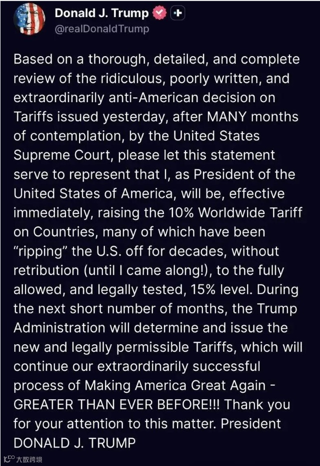 此举系对美国最高法院裁定的快速回应。2月20日,最高法院以6比3裁定:特朗普政府依据《国际紧急经济权力法》(IEEPA)征收大规模关税属越权行为,侵犯国会征税权。