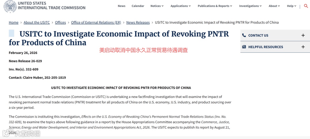 2月26日,美国国际贸易委员会(USITC)发布公告,正式启动评估程序,研判撤销中国“永久正常贸易关系”(PNTR,即最惠国待遇)地位对美国经济的潜在影响。此举标志着美方在对华贸易政策层面释放出新的重大信号。