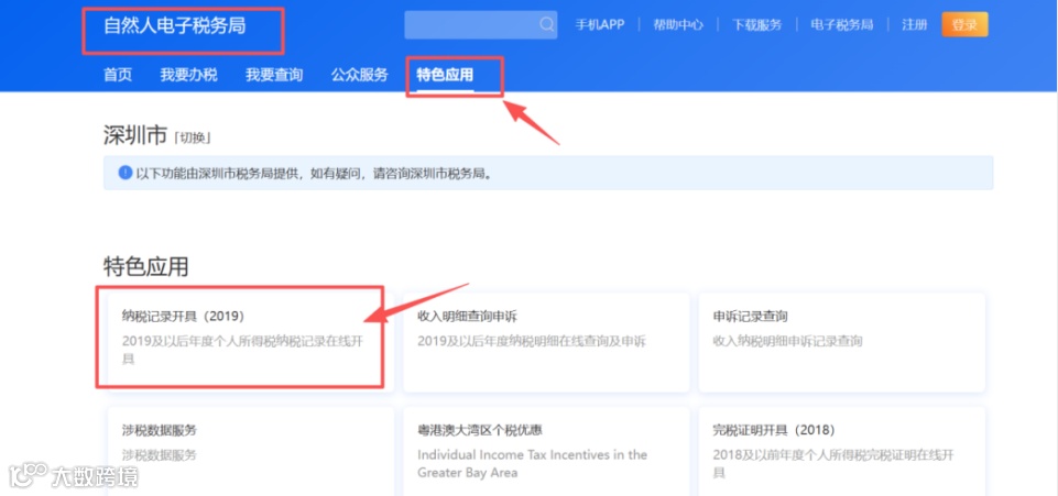 进入【特色应用】→【纳税记录开具】,选择税款所属期,输入验证码后点击【申请生成纳税记录】,下载PDF文件即可。