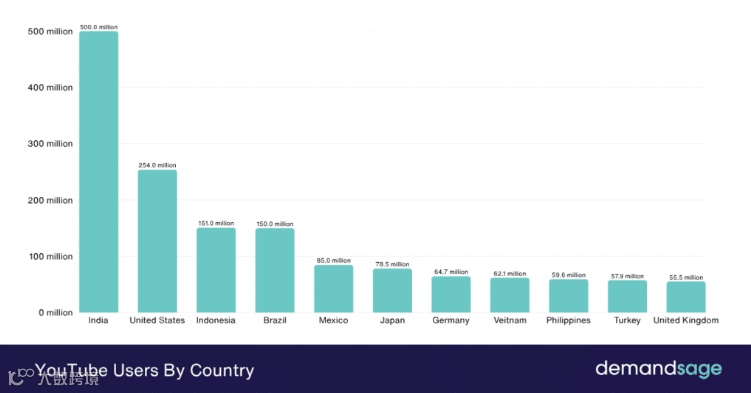 按国家划分,YouTube用户量排名前五为:印度(5亿)、美国(2.5亿)、印尼、巴西、墨西哥、日本。