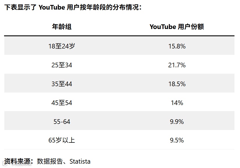 YouTube主力用户年龄集中在18–44岁,但55岁以上用户占比达20%。