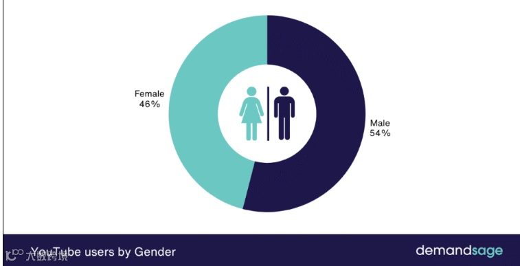 全球YouTube用户性别比为54%男性 vs 46%女性,男性多出8个百分点;但美国为51.2%女性 vs 48.8%男性,英国基本持平。