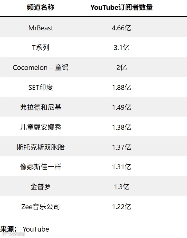 订阅量TOP2频道为:MrBeast(4.66亿)、印度T-Series(3.1亿)。