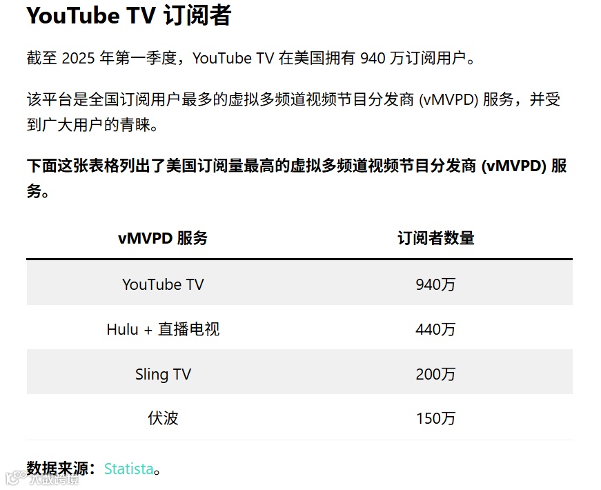 同时,YouTube TV在美国表现强劲,月费60–70美元,覆盖940万家庭电视用户——这是北美独有的高价值场景。