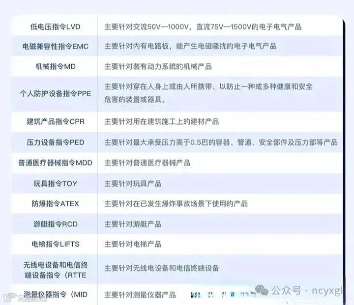 CE认证覆盖范围由具体“欧盟指令”界定。指令是规定产品基本安全要求与合规路径的技术法规,按产品类别分别制定,例如: