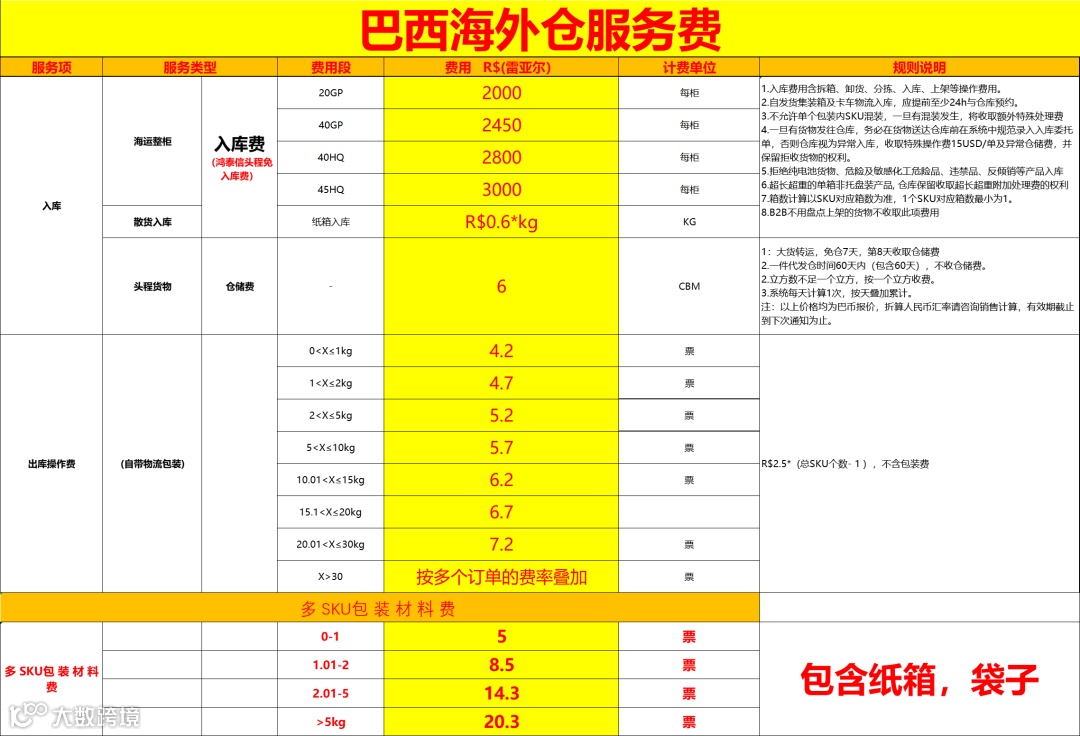 | 一、报价适用于货物抵达巴西圣保罗市仓库自提;圣保罗市内可安排武装押送至私人仓、美客多或亚马逊电商仓(10公里内免派送费,超11公里加收400美元/票);其他州派送费用需单票确认。 |