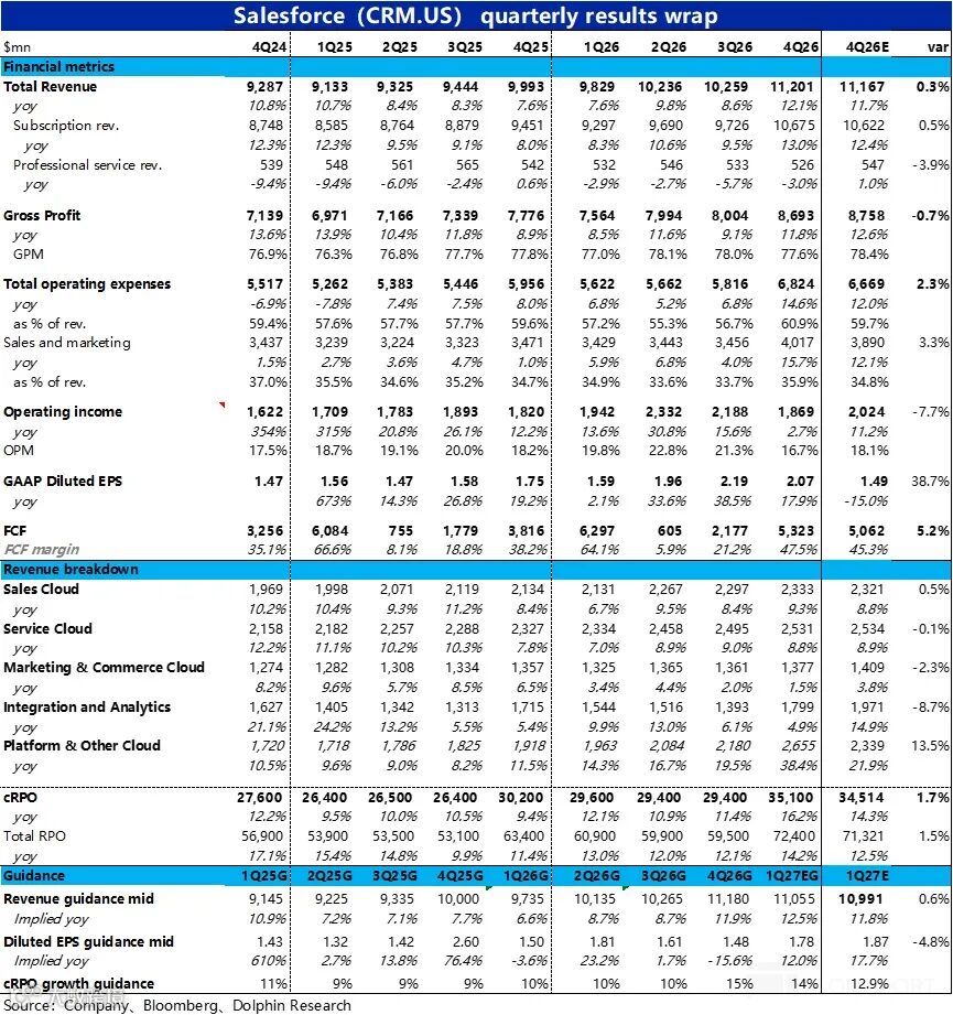 Q1营收指引为110.3亿至110.8亿美元,名义增速约12%–13%;CRPO名义同比预计增长约14%。