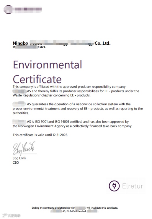 根据法规要求,所有在挪威市场投放电子电气设备的生产者,必须加入经挪威环保局(Miljødirektoratet)认可的生产者责任组织(PRO),履行收集、处理、回收及环境无害化处置义务。