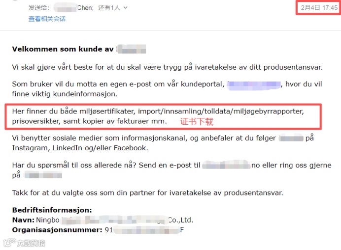 2026年1月22日客户提交完整资料 → 2026年2月4日成功获取挪威WEEE注册证书,全程仅用10个工作日。