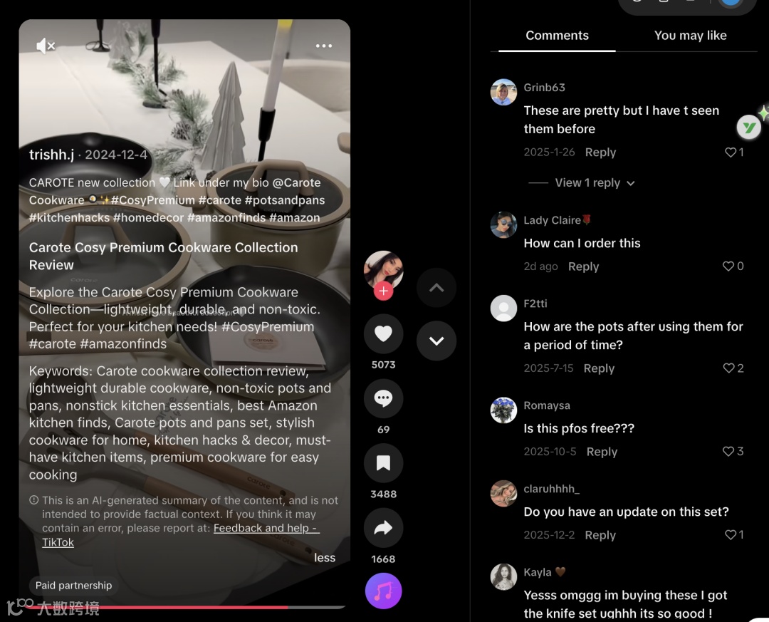 在海外家居厨具赛道,“专业测评”与“生活方式种草”正形成互补:前者建立理性认知,后者触发消费冲动。Our Place靠专业测评构建信任,CAROTE则借生活方式达人实现高效种草与转化。
