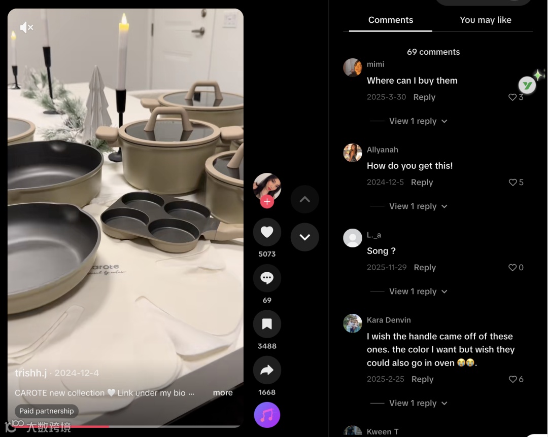 该视频获5073次点赞、69条评论、3488次收藏及1668次分享。收藏与分享量明显高于点赞比例,显示用户倾向“保存或转发以备购买”,具备较强转化潜力;评论区集中于“哪里购买”“是否适用烤箱”“材质安全性”等问题,印证内容成功激发真实消费兴趣。