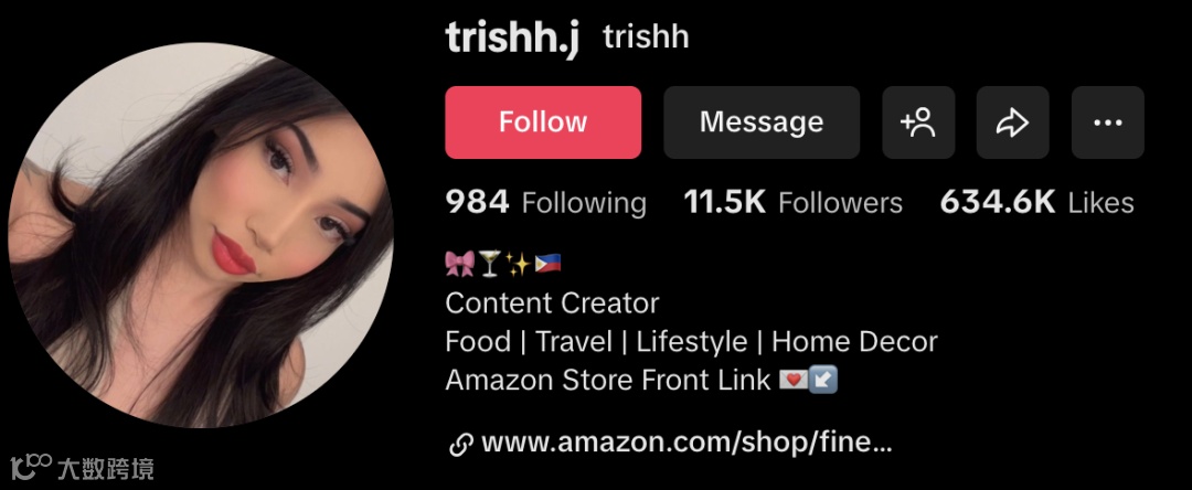 trishh.j 是聚焦美食、旅行与家居美学的生活方式创作者,拥有约1.15万粉丝。内容具备强“精致生活感”,画面统一、风格干净,覆盖健康饮食、度假记录及餐桌布置等多元场景;主页设有Amazon storefront,具备明确带货能力,属典型尾部“种草型达人”。