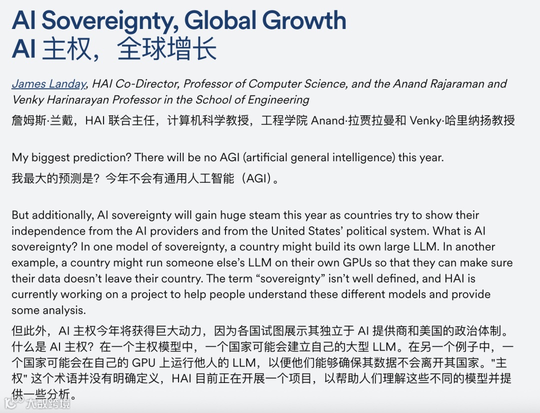 关于AGI,HAI联合主任James Landay直言:“今年不会出现AGI。”但技术演进未止步——AI主权(AI Sovereignty)成为新焦点:核心不是模型大小,而是模型部署位置、数据掌控权归属。