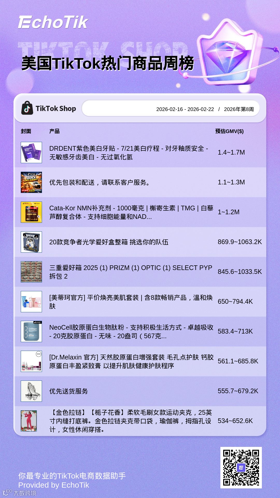 榜单反映当周平台热销商品趋势。美国站TOP1商品为DRDENT紫色美白牙贴(7/21疗程装),主打安全无过氧化氢配方,预估GMV为140万–170万美元。