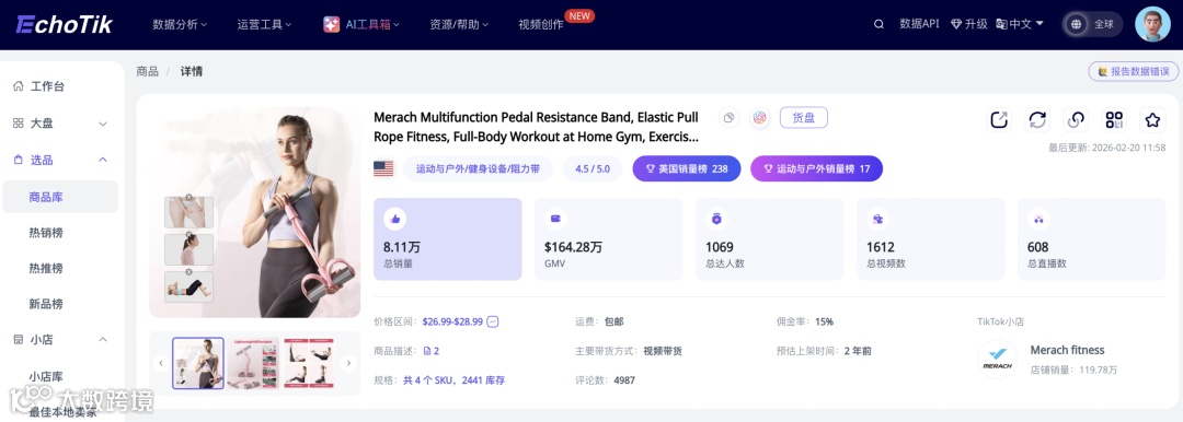 数据显示,专业健身品牌Merach旗下小店Merach fitness(@merach.us)该单品销量达8.1万件,总GMV约1200万元人民币;近一个月售出超1万件,销售额210万元。另一美区小店TYglobalshop(@tyglobalshop)上架4个月,销量已达4.9万件。