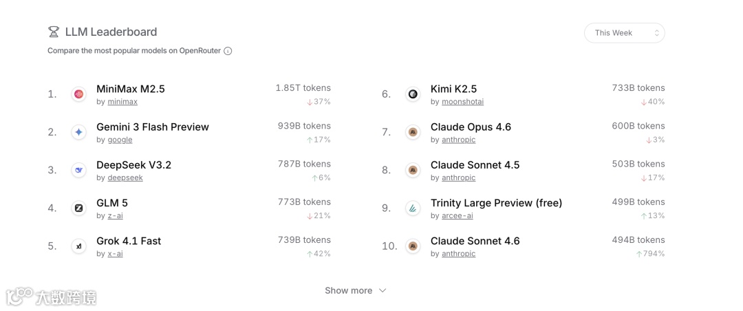 2026 年 2 月 24 日,OpenRouter 周度数据公布:平台前十模型总 Token 消耗约 8.7 万亿,中国模型独占 5.3 万亿(61%)。MiniMax M2.5 以 2.45 万亿 Token 居首,Kimi K2.5、智谱 GLM-5 紧随其后。