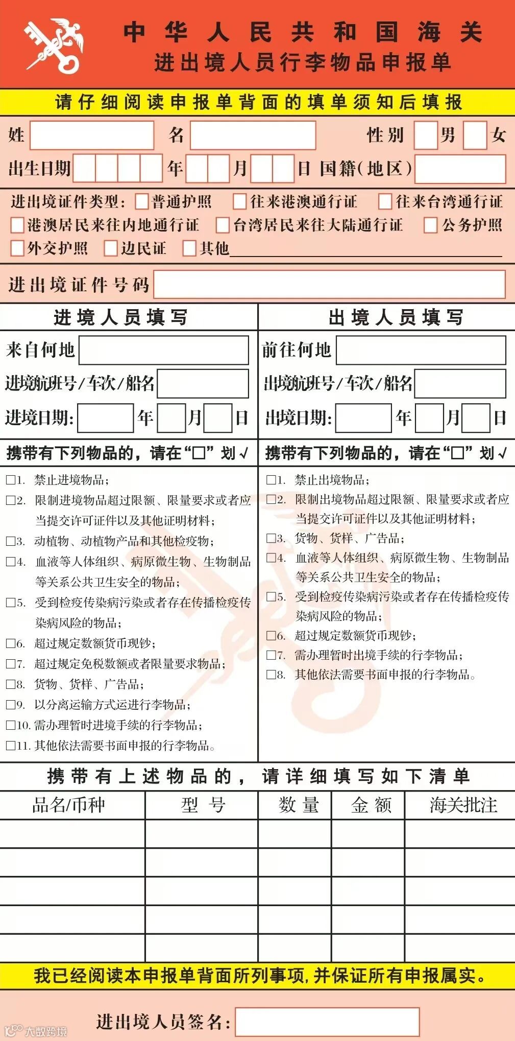 补充说明:如需纸质申报,请在入境时选择红色通道向海关领取《申报单》;如需电子申报,请在微信/支付宝中搜索“海关进出境人员指尖服务”小程序,根据指引进行申报,并在入境时选择红色通道,接受海关验核。