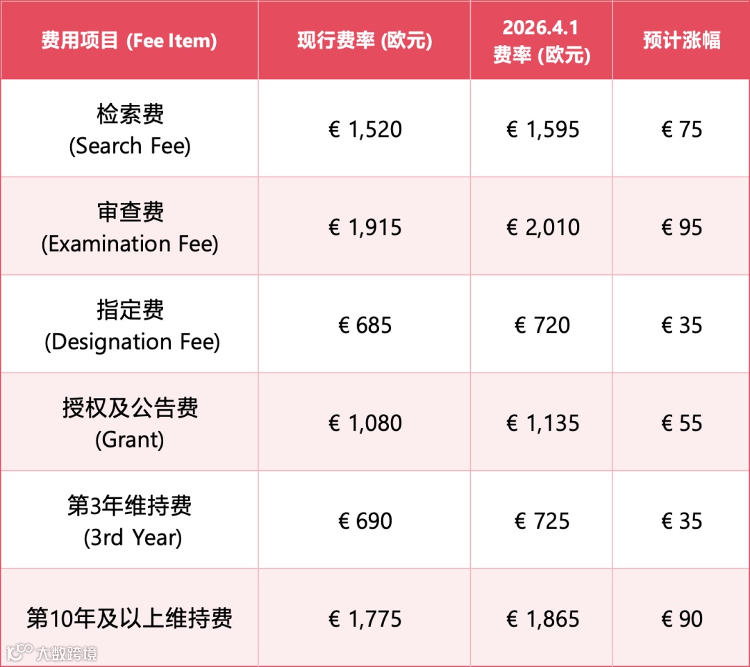 1、核心程序费齐涨:检索费将从现在的 €1,520 涨到 €1,595;审查费更是直接突破 €2,000 大关,涨至 €2,010。这意味着,光是把专利递进去到审查,你的门槛费就高了一截。