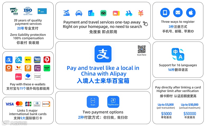 作为入境人员在中国的百宝箱,支付宝App推出面向入境游客的移动支付和旅行服务,助力全球游客用手机畅游中国。入境用户下载支付宝、绑定银行卡后(目前已支持国际银行卡包括Visa、Mastercard、JCB、Discover®和Diners Club International®卡),即可跟境内用户一样,在中国吃喝玩乐购日常场景数千万商家刷支付宝付款。