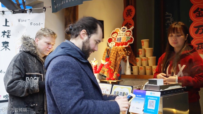 图为:外国游客在杭州网红街道小河直街用支付宝买糖葫芦