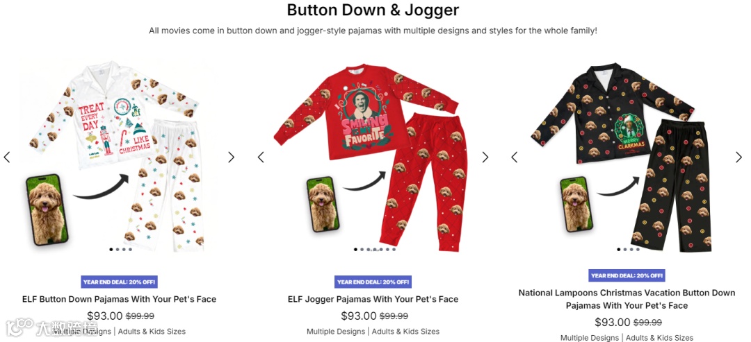 Cuddle Clones通过定制宠物形象与经典电影IP结合,推出联名睡衣系列,并同步覆盖成人、儿童及全家款式,把产品自然嵌入节日、家庭陪伴与仪式性场景之中。这些产品不仅保留了定制的情感属性,还具备“可穿、可晒、可纪念”的使用路径,使消费者更容易在脑海中预演购买后的具体体验。