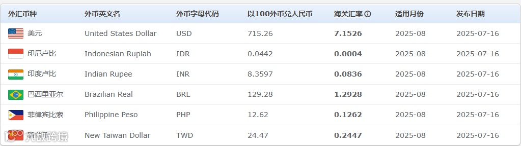 2025年7月适用汇率表