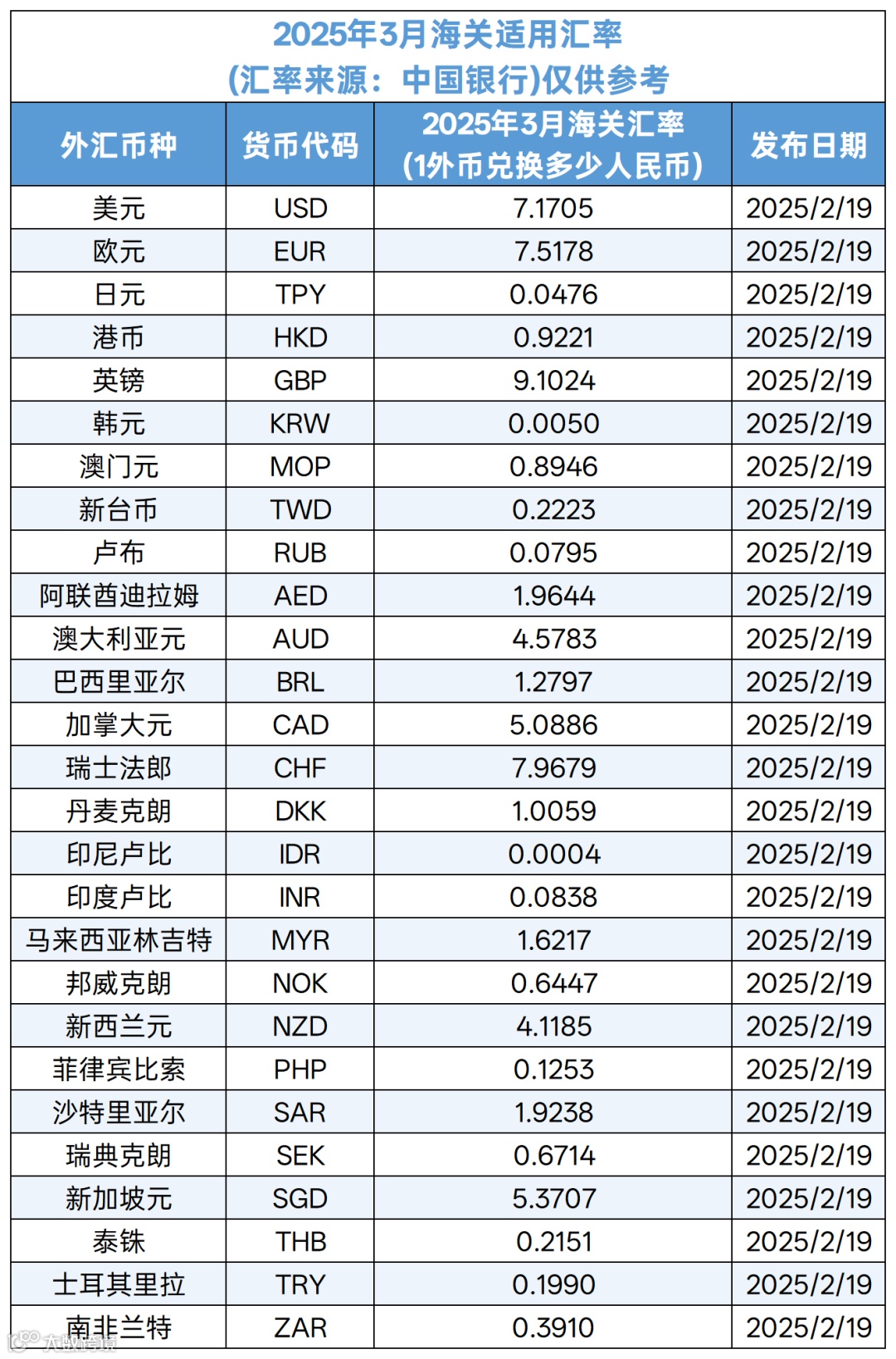 2025年3月适用汇率表